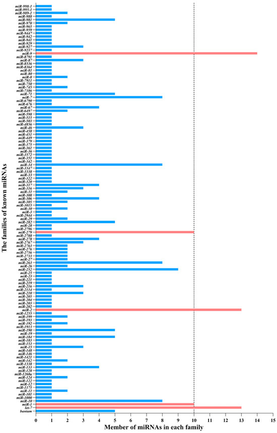 The members of known miRNAs identified in Loxostege sticticalis antennae in each of the miRNA families. The families with more than ten members are marked in red color, while the others are shown in blue color.