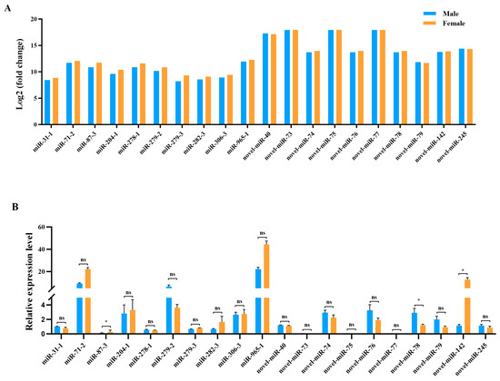 The ten most abundant known and novel miRNA expression levels in male and female antennae of Loxostege sticticalis. (A,B) The expression levels of the transcripts and qRT-PCR, respectively. Fold change: normalization values in small RNA sequencing data. “ns” indicates no significant differences and “*” significant differences at the p < 0.05 level.