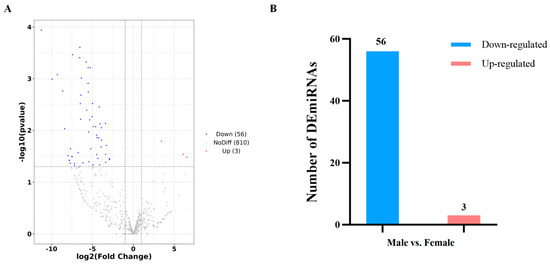Analysis results of differentially expressed miRNAs (DEmiRNAs) in the antennae of Loxostege sticticalis. (A) Volcano plot of DEmiRNAs in male vs. female libraries. (B) Number of DEmiRNAs in male and female antennae of L. sticticalis. Blue, red, and gray dots represent down-regulation, up-regulation, and no differences in expression levels, respectively.