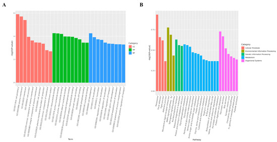 The GO functional analysis showed that the predicted target genes were enriched in 19,882 terms in the three categories of cellular components (CCs), molecular functions (MFs), and biological processes (BPs) (Figure 5A and Figure S4A, Table S5). A total of 2392, 2157, and 4015 miRNAs were enriched in the terms cell periphery (GO:0071944), plasma membrane (GO:0005886), and membrane (GO:0016020) in the category of CCs, respectively. The MF terms were related to binding, with more than 1000 miRNAs being enriched in ribonucleotide binding (GO:0032553), purine nucleotide binding (GO:0017076), and purine ribonucleotide binding (GO:0032555). Regarding the terms in the BP category, 2044, 3647, and 1393 miRNAs were enriched in cell development (GO:0048468), localization (GO:0051179), regulation of localization (GO:0060341), and regulation of transport (GO:0032879). Furthermore, the results of the KEGG analysis show 253 functional pathways in the five categories of cellular processes, environmental information processing, genetic information processing, metabolism, and organismal systems, with 96, 80, 65, 59, and 75 miRNAs being enriched in peroxisome (ko04146), neuroactive ligand–receptor interaction (ko04080), nucleocytoplasmic transport (ko03013), glycerophospholipid metabolism (ko00564), and protein digestion and absorption (ko04974), respectively (Figure 5B and Figure S4B, Table S6).