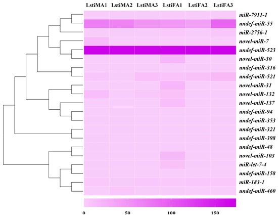 The heatmap analysis of chemosensory-related miRNAs in the antennae of males and females by transcript abundance in Loxostege sticticalis. MA, male antenna; FA, female antenna. The number (1–3) after each sample represents the biological replicate.