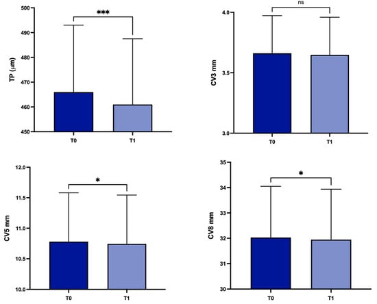 Values of corneal thickness at the thinnest point, and corneal volume at baseline and 1 year later in the overall study population. TP: corneal thickness at the thinnest point; CV3: corneal volume at 3 mm diameter; CV5: corneal volume at 5 mm diameter; CV8: corneal volume at 8 mm diameter; T0: baseline; T1: 1 year later; ns, not significant; * p < 0.05; *** p < 0.001.