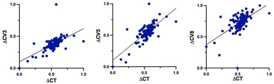 There were statistically significant positive correlations between changes of TP and CV at 3 mm (r = 0.6324, p < 0.0001), 5 mm (r = 0.7622, p < 0.0001) and 8 mm (r = 0.5987, p < 0.0001) (Figure 5).