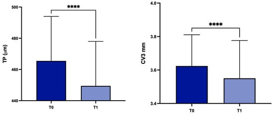 Values of TP, CV3, CV5 and CV8 values at T0 and in the subgroup A. TP: corneal thickness at the thinnest point; CV3: corneal volume at 3 mm diameter; CV5: corneal volume at 5 mm diameter; CV8: corneal volume at 8 mm diameter; T0: baseline; T1: 1 year later; ** p < 0.01, *** p < 0.001, **** p < 0.0001.