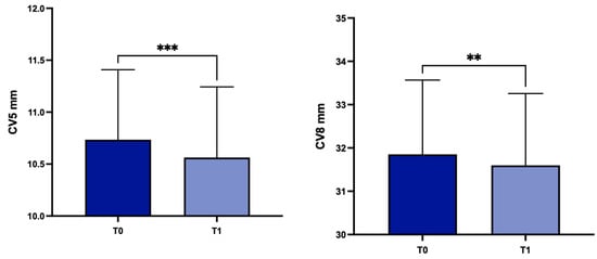 For the entire group of keratoconus patients, in comparison with T0, mean TP decreased at T1 from 458.7 ± 52.2 µm to 454.6 ± 51.6 µm (p = 0.0004); in the same period, statistically significant differences were detected regarding CV at 5 mm and 8 mm (from 10.78 ± 0.8 mm3 to 10.75 ± 0.79 mm3, p = 0.02, and from 32.03 ± 2.01 mm3 to 31.95 ± 1.98 mm3, p = 0.02, respectively). Conversely, there were no statistically significant differences in CV at 3 mm from T0 (3.66 ± 0.31 mm3) to T1 (3.64 ± 0.31 mm3) (p = 0.08) (Figure 4), or for ACD (p = 0.2568) and ACV calculated at 3, 5 and 8 mm (p = 0.8464, p = 0.4627, p = 0.3714 respectively).