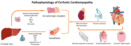 Cardiac dysfunction in patients with LC is the result of the cardiac remodeling that ensues as a compensatory response to the high output state [7]. The high output state is precipitated by low peripheral resistances induced by arterial vasodilation in the splanchnic circulation. Indeed, alterations in systemic circulation have been correlated with changes in hepatic blood flow and portal pressure [11]. Underlying mechanisms include the dysfunction of liver sinusoidal endothelial cells, which increases hepatic vascular resistance, triggering signals that increase the production of vascular endothelial growth factor, angiotensin-(1–7), endocannabinoids, nitric oxide synthase, carbon monoxide, adrenomedullin, and prostacyclin, among others [12,13,14,15]. These molecules facilitate the formation of collateral portosystemic vessels and induce peripheral vasodilation [16]. Despite the activation of the sympathetic nervous system, vascular smooth muscle cells fail to constrict properly in response to adrenergic stimulation [17].