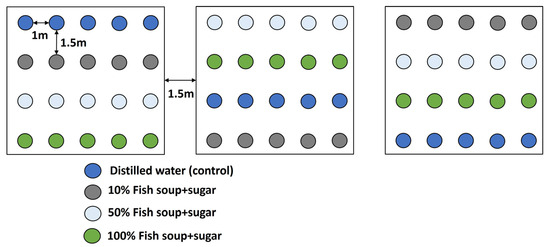 For the first experiment, a series of dilutions of 50% and 10% were prepared from the initial concentration (100%) with the addition of distilled water. Three treatments (100%, 50%, and 10% fish soup and sugar) were prepared for immediate subsequent spray, while distilled water was used as a control.