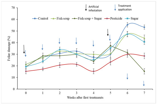 Percentage of foliar damage by fall armyworm after application of treatments. Note: Artificial infestation, treatment applications, and data collection were conducted consecutively after every 24 h in weeks 0 and 5 post-treatment applications.