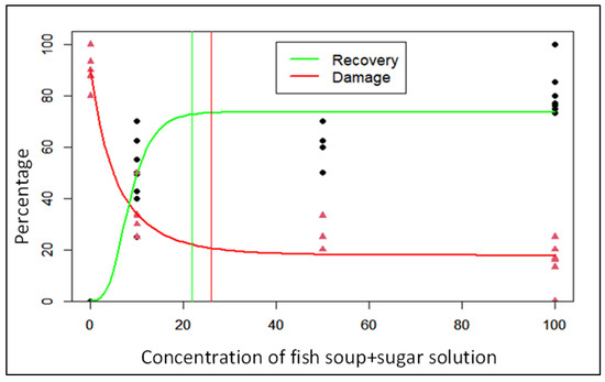 The minimal FAW foliar damage and optimal plant recovery rates of maize plants treated with fish soup and sugar solutions were 17.8 ± 1.9% and 73.6 ± 2.4%, respectively (Table 1). Substitution of the Gompertz model equation indicated that concentrations of fish soup required for minimal FAW foliar damage and optimal plant recovery were 25.9 and 21.8%, respectively (Table 1).