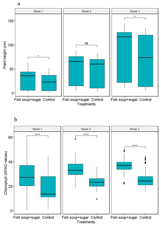 Maize plant height (a) and chlorophyll content (b) after being sprayed with a 50% concentration of fish soup and sugar and control (distilled water). ns implies no significance, while * and **** imply significance at p = 0.05 and p = 0.0001, respectively, between treatments according to the Tukey test.