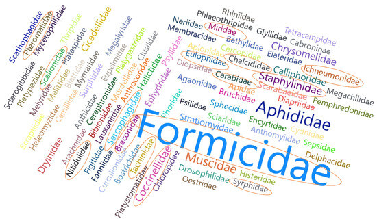 Generally, across different orders of insects observed, the most abundant insect families were Formicidae, Aphididae, Muscidae, Coccinellidae, Chrysomelidae, and Dryinidae (Figure 6).