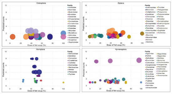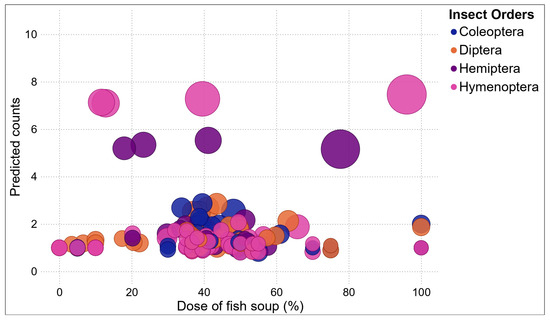A probit regression confirmed that the numbers of insects in different orders visiting treated maize plants varied across fish soup concentrations (Figure 7; Supplementary Materials). The highest frequencies of Coleopterans, Dipterans, and Hymenopterans are likely to be recorded at 30–60% concentrations of fish soup and sugar, while the frequency of Hemipterans was highest at 45–60% concentrations of fish soup and sugar (Figure 8).