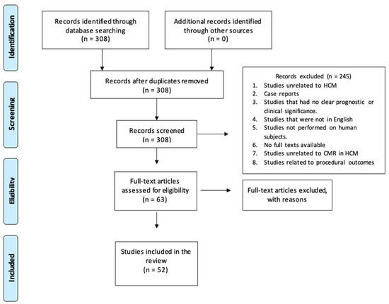 Initial PubMed results from these search terms came to 308 studies. An abstract review was performed by a single independent reviewer using the systematic review methodology, and application of the inclusion and exclusion criteria reduced this to 63 studies. Further results were excluded for being related to surgical and procedural outcomes, those focused specifically on other factors such as ECG findings and not CMR, and those with no full text available. The final count of relevant articles that met all inclusion criteria was 52 (Figure 1). These studies were reviewed for correlations between our line of inquiry and the available data.