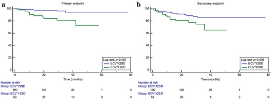 Kaplan–Meier curves from Li et al. [16] demonstrating survival free from events for the primary endpoint (composite of CV death, heart transplant, aborted SCD, and syncope requiring CPR) in KM curve (a), and for the secondary endpoint (heart failure hospitalizations) in KM curve (b), for subjects with ECV > 2 SD above mean (green curve) vs. those with ECV ≤ 2SD above mean (blue curve) (reproduced with permission).