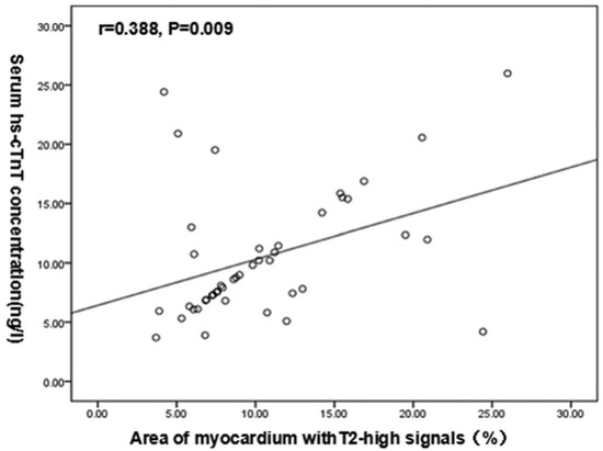 Chen et al. [20] investigated the relationship between T2 signal on CMR and high-sensitivity cardiac troponin T (hs-cTnT), demonstrating a strong association between increasing hs-cTnT levels and both the number of cardiac segments with elevated T2 (p = 0.002) and the percent of myocardium involved (Pearson correlation: r = 0.388, p = 0.009, Figure 3). They also noted that segments with elevated T2 were significantly more hypertrophied than those without, suggesting the possibility that edema may be a marker of active disease in HCM. Logistic regression analysis identified the percentage of myocardium with a high T2 signal to be the only independent predictor of elevated hs-cTnT (OR: 0.707, 95%CI: 0.505–0.981, p = 0.038). These findings suggest that prolonged T2 decay is an indicator of myocardial damage in hypertrophic cardiomyopathy and merits further assessment as a biomarker in this condition.