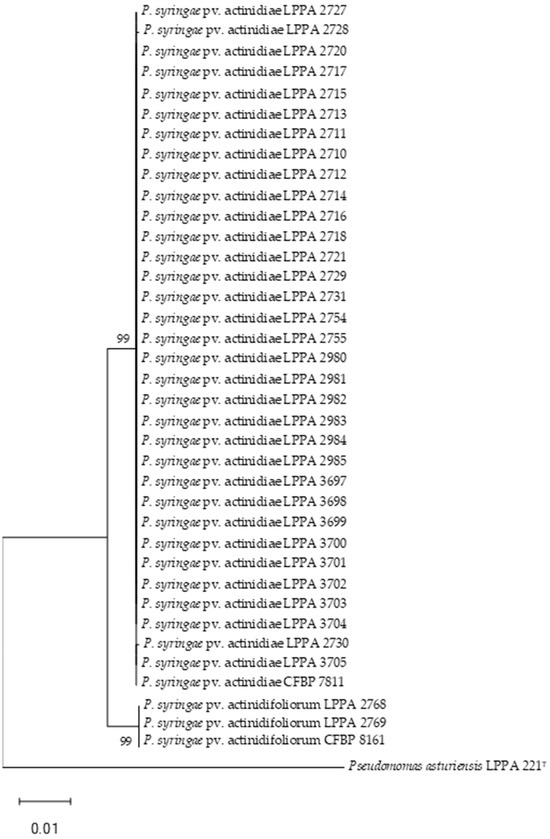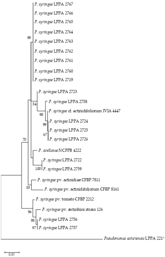 Sequences of concatenated and individual amplified genes were aligned using Clustal W [59], and phylogenetic trees were constructed based on each individual locus and the three concatenated genes by the maximum likelihood method with the Tamura–Nei model. Their topological robustness was evaluated by bootstrap analysis based on 1000 replicates using MEGA 11 software [60]. Pseudomonas asturiensis LPPA 221T was used as the outgroup. Sequences of Psa, Pfm and other pvs. of P. syringae obtained from the GenBank databases were included for comparison in the phylogenetic analysis (Supplementary Table S1).