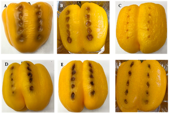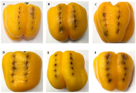 Inoculation of Psa and Pfm on Capsicum annum cv. California. (A) LPPA 2769. (B) Pfm CFBP 8039. (C) Control without inoculation. (D) LPPA 2727. (E) LPPA 3700. (F) Psa NZ 10627.