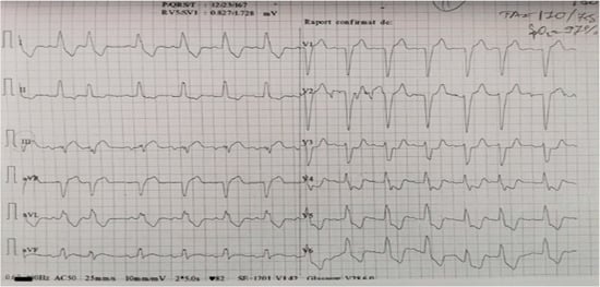 The patient is an 81-year-old male who is a former smoker with about 30 packs/year, and a non-smoker for about 15 years who has a known familial history of colorectal cancer. No prior cancer screening was performed on the patient. His personal history includes arterial hypertension and dyslipidemia, with intermittent episodes of stable angina pectoris at high exertion and prostatic hyperplasia. At 06:00 a.m. the patient presented at the Emergency Department after several intensive angina pectoris episodes that partially succumbed to administration of sublingual nitroglycerin, which started 2 h before arrival. Physical examination on admission revealed a BMI of 29.5 kg/m2 SC, and a BP of 170/75 mmHg, with no other significant pathological features detectable at the time of presentation. The EKG showed a sinus rhythm with left bundle branch block (age undetermined) (Figure 1); high-sensitivity cardiac troponin (hs-cTn) levels at presentation were normal, with a CK-MB above normal; and 1 h later, hs-cTn showed an increase of more than 10 times the normal value.