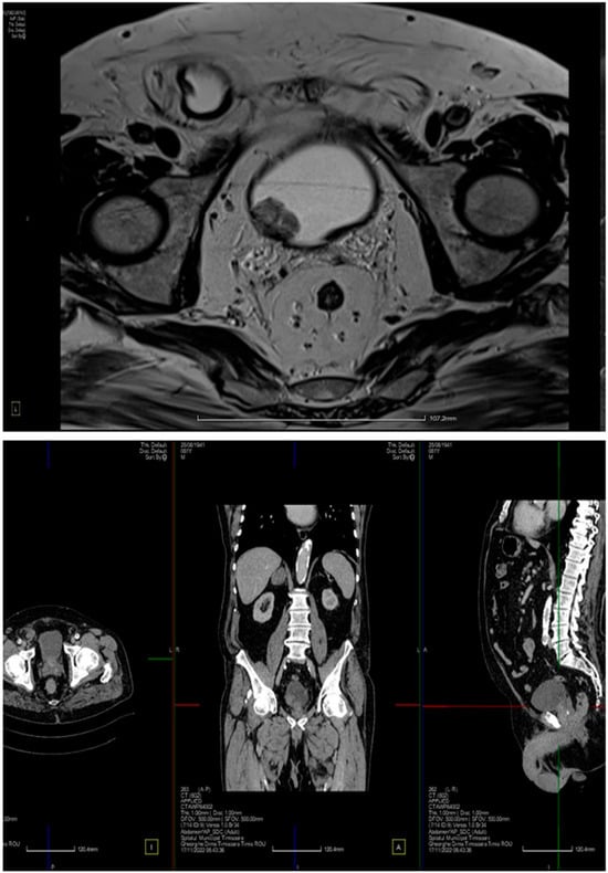 On rectal examination, a tumor formation was identified approximately 5 cm from the external anal opening, and a recto-sigmoidoscopy with biopsy sampling was performed. Imaging (Figure 3) suggested the presence of both a rectal tumor and the presence of an intravesical tumor. The computed tomography showed a diffuse thickening of the lower rectum at 6 cm in length, just above the anal canal, with bilateral infracentimetric inguinal lymph nodes. Other significant elements of the digestive tract were a small inguinal uncomplicated hernia and several diverticula of the sigma. On the other hand, the tomography identified a suspicious mass (30 mm in diameter) on the lateral wall of the bladder and a protruding median lobe of the prostate.