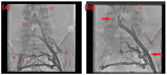- Rastogi, N.; Kabutey, N.-K.; Kim, D. Incapacitating Pelvic Congestion Syndrome in a Patient with a History of May–Thurner Syndrome and Left Ovarian Vein Embolization. Ann. Vasc. Surg. 2012, 26, 732.e7–732.e11. [Google Scholar] [CrossRef] [PubMed]
