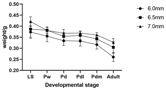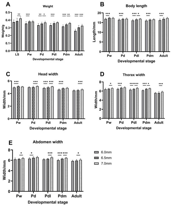 The frame with combs of different cell sizes was returned to the same colony to allow the queen bee to lay eggs. Only worker eggs were laid in 5.0 mm wide cells, and both worker and drone eggs were produced in 5.5 mm wide cells, while only drone eggs were found in cells of larger sizes. We collected drone brood from 6.0 mm, 6.5 mm, and 7.0 mm wide cells and measured several morphological indicators, such as body weight, body length, head width, thorax width, and abdomen width. Different developmental stages of drone brood were sampled, including LS (5th instar larva after sealing), Pw (pupa with white eyes), Pd (pupa with dark-brown eyes), Pdl (pupa with dark-brown eyes and lightly pigmented thorax), Pdm (pupa with dark-brown eyes and medium colored thorax), and newly emergent adults. The developmental stages were characterized according to the previous studies [18,19]. At least 20 drones were collected randomly from each comb at each stage. Then, the weights of the drones were measured with an electronic balance (Sartorius, Sartorius Group, Göttingen, Germany). Furthermore, other morphological indicators of drones, including head width, thorax width, abdomen width, and body length, were measured with a digital vernier caliper.