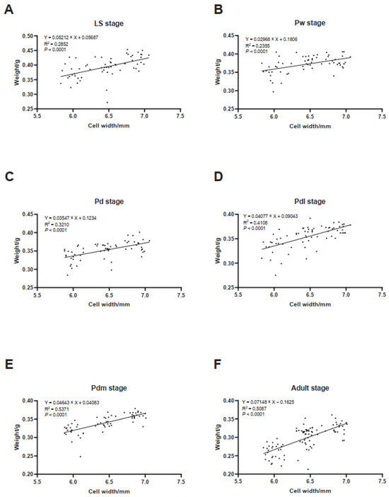As shown in Figure 3, no matter the developmental stage, the body weight of drones linearly increased with the sizes of comb cells (simple linear regression; Figure 3A, the LS stage, slope = 0.052, p < 0.0001; Figure 3B, the Pw stage, slope = 0.030, p < 0.0001; Figure 3C, the Pd stage, slope = 0.035, p < 0.0001; Figure 3D, the Pdl stage, slope = 0.041, p < 0.0001; Figure 3E, the Pdm stage, slope = 0.046, p < 0.0001; Figure 3F, the adult stage, slope = 0.071).