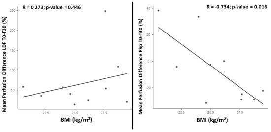 The LDF perfusion differences between D0 and D30 were not associated with BMI (Figure 1—left panel). However, perfusion differences measured with PSp could be associated with the BMI (Figure 1—right panel). Using linear regression adjusting for the effect of sex, we found this association to be statistically significant (β = −0.798 [95%CI −1.320; −0.275]; p = 0.009).