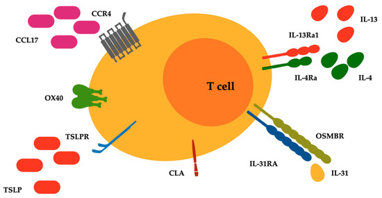 Surface receptors related to type 2 inflammatory pathways expressed on malignant lymphocytes of T cell cutaneous lymphoma. Abbreviations: CCL17, C-C motif chemokine ligand 17; CCR4, C-C chemokine receptor type 4; CLA, cutaneous lymphocyte antigen; IL-4Ra, IL-4 receptor alpha; IL-13Ra1, IL-13 receptor alpha 1; IL-31RA, IL-31 receptor A; OSMRB, oncostatin M receptor beta; OX40, T cell co-stimulatory receptor CD134; TSLP and TSLPR, thymic stromal lymphopoietin and its receptor.