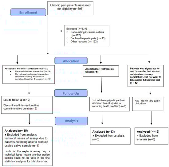 This mixed-factorial mechanistic clinical study included sixty-five participants; comprising 50 patients with chronic pain, and 15 healthy controls. All groups were matched for age, gender (m/f/non-binary), race and ethnicity. All study procedures were ethically approved by the Vanderbilt Institutional Review Board. The study design was further subsumed into (1) baseline assessments between 50 chronic pain patients (mean age 38.9 years/10.98 s.d.) and 15 matched healthy controls (mean age 33.1 years/10.71 s.d.), and (2) the clinical trial investigation into the effects of mindfulness treatment for chronic pain that included 38 chronic pain patients (of the original 50 chronic pain patients, only 38 signed up for the clinical trial, the remaining 12 provided data during one testing session only to be used for the baseline chronic pain versus healthy control comparisons so to increase sample numbers for analysis since clinical populations can have high variability in biological variables); 24 who underwent the Mindfulness-Based Pain Management intervention, and 14 who were an active “wait-list” control. While it was not possible to conduct true randomization for Mindfulness-Based Pain Management vs. wait-list control group due to logistical reasons, the wait-list control group were chronic pain patients who had no prior experience in meditation/mindfulness but had an interest to attend a mindfulness treatment for their chronic pain in the future. Thus, provided a clinically meaningful patient control group for this study. Due to study drop-outs and issues with providing a quality saliva sample for the assays, the final full dataset usable for statistical analysis included 15 chronic pain patients exposed to Mindfulness-Based Pain Management (mean age 41.3 years/10.61 s.d.) and 13 chronic pain patients in the wait-list control group (mean age 38.6 years/11.25 s.d.), since some patients dropped out from the study and/or did not meet the full attendance requirement for the Mindfulness-Based Pain Management intervention. The 15 chronic pain patients in the Mindfulness-Based Pain Management also lost a further dataset for the oxytocin analyte only due to technical issues with the assaying process. See Figure 1 for a consort schematic outlining the recruitment, follow-up, and final analyses samples.