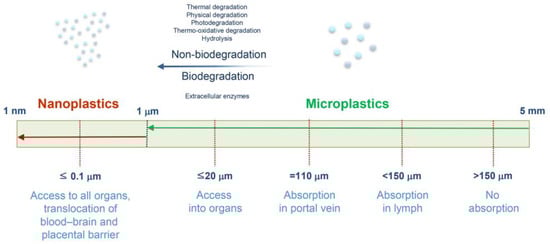 In 2004, the risks associated with MNPs were introduced, and their potential adverse effects on living organisms have recently attracted considerable attention [24,25,26]. After deposition in the environment, plastic waste is degraded into small fragments by exposure to ultraviolet (UV) radiation, oxidation, biodegradation, disintegration, and mechanical erosion, eventually resulting in MNPs [27,28]. Microplastics (MPs) are small artificial polymer particles (<5 mm) that are not the end products of plastic waste, given that they degrade into nanoplastics (NPs) (<1000 nm) [29,30] (Figure 1).