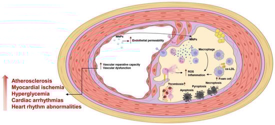Recently, MNPs have emerged as a serious hazard in the environmental and food safety fields, causing cellular damage and affecting cell survival, death, apoptosis, inflammation, and various immune responses. Overall, this review focused on discussing the association between MNP exposure and vascular diseases (summarized in Table 1 and Table 2 and Figure 3).
