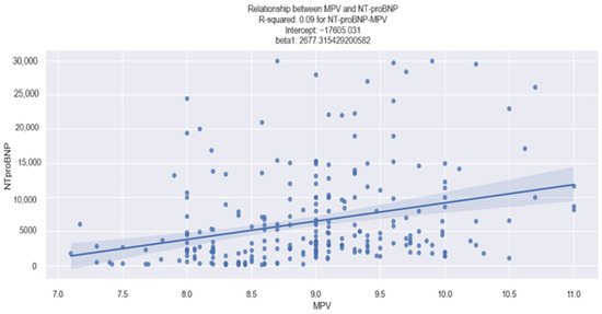 This hypothesis, according to which there is a linear relationship between MPV and NT-proBNP, is depicted in Figure 1. The graph shows a tendency for the NT-proBNP value to rise as the MPV value increases. As an example, in a patient with an MPV value of 10.5 fl, an associated NT-proBNP value over 10.000 pg/mL can be anticipated.
