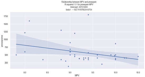 Due to the fact that in our sample of patients with HF there was not a very large number of patients with available presepsin data, it was not possible to identify the existence of a relevant linear relationship between the MPV value and presepsin value. The depicted figure (Figure 2) illustrates somewhat contradictory findings. Contrary to our expectations, patients with higher MPV values exhibited a tendency towards lower presepsin values, rather than the anticipated trend of higher presepsin values. This observation contradicts the statistical results commonly reported in the medical literature regarding the correlation between MPV and sepsis.