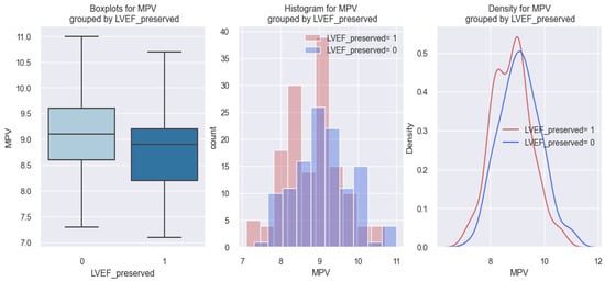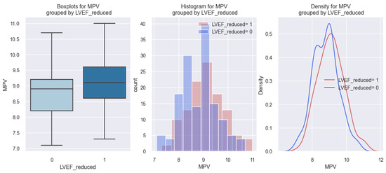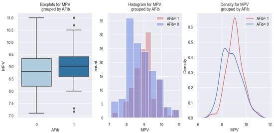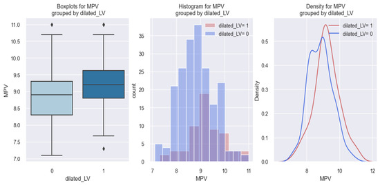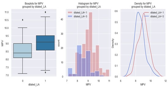 In the first graph of Figure 14, it can be seen that patients with a dilated LA (1) had a higher MPV value (about 9.1 fl) in comparison to those with a non-dilated LA (0), who had MPV values below 9 fl (8.4 fl), and in the following two graphs, a tendency was observed for patients with a dilated LA (1) to be distributed more to the right, thus towards higher values of MPV.