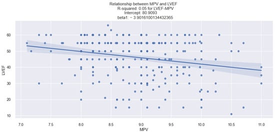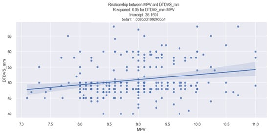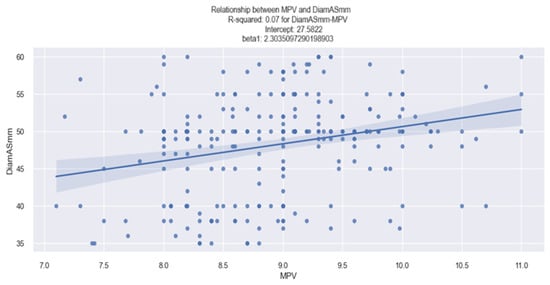 The conclusions obtained from the analysis of the data above are depicted in Figure 16, which is a graphical representation of the linear relationship between the MPV value and the LV diameter, and from which we can observe a tendency of the LV diameter to increase as the MPV value increases.
