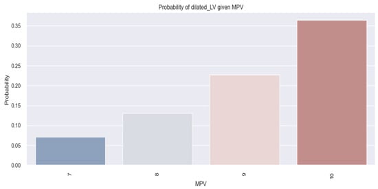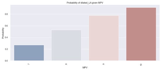 The aforementioned results are more effectively illustrated through the application of the logistic regression model. The graphical representation of this model is depicted in Figure 15, which reveals that for HF patients with an increased MPV, there is a tendency of an increased probability of them having a dilated LA (for example, there is an over 80% chance for a patient with an MPV of 10 fl to have a dilated LA, versus a patient with an MPV of 8 fl, for whom this chance is under 60%).