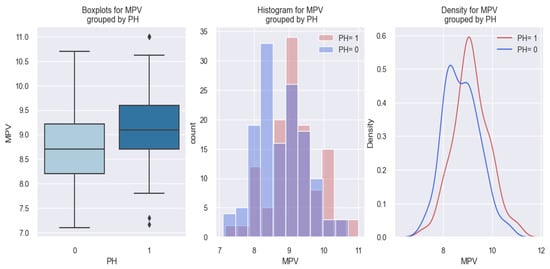 In the first graph of Figure 19, it can be observed that the presence of PH (PH = 1) is associated with an increased MPV value in comparison to the absence of PH (PH = 0) in our studied population, and from the following two graphs, it can be seen that patients with PH are distributed more towards the right, so towards higher MPV values, hence there is a slight tendency for MPV values to be higher for patients with PH.