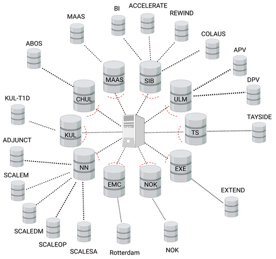 As the federated database contains sensitive data, a secure access policy is critical to safeguard against unauthorized access. The set-up is configured so that access is controlled in two phases: there is first a user authentication phase, which is followed by a local authorization step. User authentication (verification of a user’s identity against a centrally managed list of users) is managed using Agate (https://www.obiba.org/pages/products/agate/, accessed on 15 August 2023), a dedicated software provided with the Opal suite by OBIBA [39]. In this first step, each collaborating node checks the validity of the user’s identity using a dedicated authentication request to Agate. The subsequent authorization phase checks that the user is entitled to access the data node he or she requested. This phase proceeds separately on each of the collaborative nodes engaged by the initial user request. The username is checked against a whitelist of authorized users, and, if present, the user receives an access token for the node. Access does not mean that the user can view or download individual-level data, but it means that the user can execute functions using the R DataSHIELD and dsSwissKnife packages, which can only return summary-level data. It is also important to note that neither the central administrator nor the remote users have direct access (e.g., by SSH) to collaborative servers, nor do remote users have direct access to the central server.