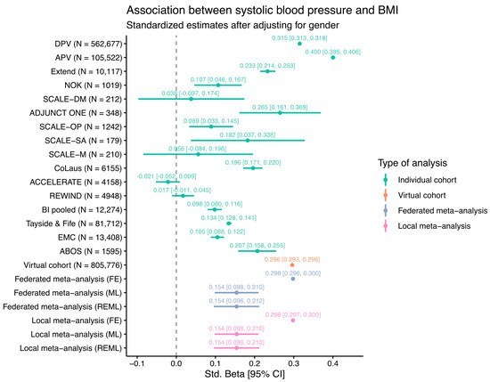 OMOP-formatted data in 16 local PostgreSQL cohort databases were queried for gender, BMI, and systolic blood pressure on eight collaborating nodes using dsQueryLibrary [20], which implements standardized OMOP queries using Opal and DataSHIELD [9]. The remote data were evaluated and prepared for analysis using the dssPivot, dssSubset, dssRange, dssDeriveColumn, and dssScale functions from the R package dsSwissKnife [14,21]. A federated linear model was fitted for BMI against systolic blood pressure, correcting for gender on the 16 combined cohorts using ds.glm from the dsBaseClient R package [22]. Individual and pooled estimates were calculated using ds.glmSLMA (dsBaseClient). For pooled estimates random effect meta-analysis under maximum likelihood (ML) or restricted maximum likelihood (REML) was used. For comparison, a meta-analysis was also performed using ML and REML locally using estimates obtained from each cohort using rma.uni from the R package metafor [23]. Results were meta-analysed using both random and fixed effects models and a forest plot was generated using ggplot2 in R [24].