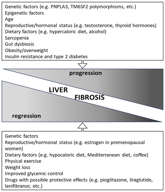 Factors associated with the progression/regression of NAFLD-associated liver fibrosis (see text for details).