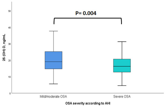 Serum 25(OH)D levels (median) by OSA severity according to AHI. Mild/moderate OSA: AHI 5 to <30 events/h; severe OSA: AHI ≥ 30 events/h. Abbreviations: 25(OH)D = 25-hydroxyvitamin D; OSA = obstructive sleep apnea; AHI = apnea–hypopnea index.