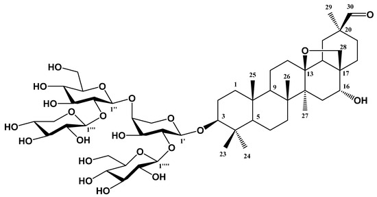 The 13C-NMR data exhibited a total of 30 carbon signals corresponding to the aglycone along with 22 carbons derived from four hexoses, indicating Compound 1 to be a triterpenoid with four hexoses. The 13C-NMR (150 MHz, DMSO-d6) spectrum showed one formyl carbon signal, δC 207.4 (C-30); one oxygenated quaternary, δC 85.6 (C-13); one oxygenated methylene, δC 76.0 (C-28); two oxygenated methines [δC 88.3 (C-3) and δC 76.1 (C-16)]; six quaternaries [δC 47.6 (C-20), δC 43.8 (C-14), δC 43.1 (C-17), δC 41.7 (C-8), δC 38.9 (C-4), and δC 36.1 (C-10)]; three methines [δC 54.9 (C-5), δC 52.6 (C-18), and δC 49.6 (C-9)]; ten methylenes [δC 38.5 (C-1), δC 35.7 (C-15), δC 33.8 (C-7), δC 32.6 (C-19), δC 31.7 (C-22), δC 31.4 (C-12), δC 29.7 (C-21), δC 25.9 (C-2), δC 18.7 (C-11), and δC 17.3 (C-6)]; and six methyls [δC 27.4 (C-23), δC 23.4 (C-29), δC 19.1 (C-27), δC 18.1 (C-26), δC 15.7 (C-24), and δC 15.3 (C-25)]. Based on the chemical shifts of the sugar carbon signals, we observed four hemiacetals [δC 105.7 (C-xyl-1), δC 104.1 (C-glc′-1), δC 104.0 (C-ara-1), and δC 102.9 (C-glc″-1)]; fourteen oxygenated methines [δC 83.7 (C-glc″-2), δC 79.2 (C-ara-2), δC 78.1 (C-ara-4), δC 77.1 (C-glc″-5), δC 76.9 (C-glc′-5), δC 76.8 (C-glc’-3), δC 76.2 (C-glc″-3), δC 75.9 (C-xyl-3), δC 75.1 (C-glc′-2), δC 74.3 (C-xyl-2), δC 71.7 (C-xyl-4), δC 70.8 (C-ara-3), δC 70.7 (C-glc′-4), and δC 70.2 (C-glc″-4)]; and four oxygenated methylenes [δC 64.2 (C-ara-5), δC 62.8 (C-xyl-5), δC 61.3 (C-glc″-6), and δC 61.1 (C-glc′-6)]; these sugars were determined to be two β-glucopyranoses, one α-xylopyranose, and one α-arabinopyranose, respectively. The oxygenated methine resonances of aglycone (C-3), glucose (C-glc″-2), and arabinose (C-ara-2 and C-ara-4) were detected at lower magnetic fields (δC 88.3, δC 83.7, δC 79.2, and δC 78.1) than the commonly detected chemical shift (δC 78, δC 75, δC 71, and δC 71). This discrepancy, attributed to glycosidation-induced shifts, provided conclusive evidence confirming the precise positions of the glycosidic linkage.