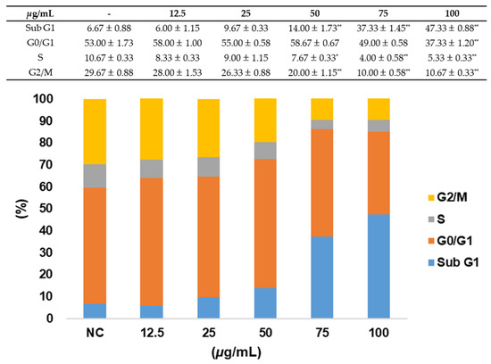 Regulation of cell cycle by L. pumila extract. A549 cells were treated with varying concentrations (0–100 μg/mL) of L. pumila extract for 24 h, and the effects were assessed using a TaliTM image-based cytometer. * p < 0.05, ** p < 0.01.