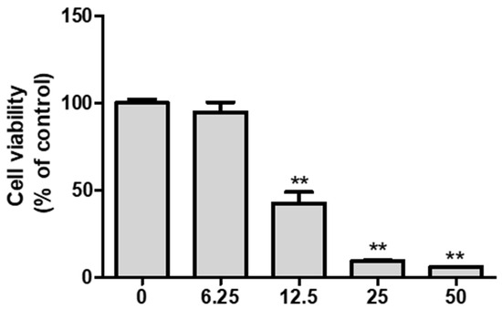 Cytotoxicity against A549 cells of ardisiacrispin A (1) from L. pumila leaves. Data are presented as the mean ± standard deviation. n = 3, ** p < 0.01.