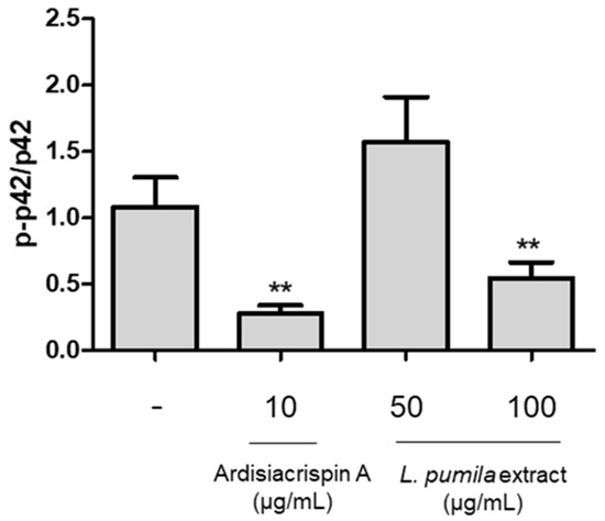 Extracellular signal-regulated kinase (ERK) plays a crucial role in tumorigenesis [27]. ERK activity is associated with the promotion of apoptotic pathways, including the induction of mitochondrial cytochrome C release, caspase-8 activation, permanent cell cycle arrest, and autophagic vacuolization. The active state of ERK is characterized by its phosphorylated form [28,29,30]. Figure 4 demonstrates that the p-ERK/ERK ratio in ardisiacrispin A-treated cells was lower than the normal control. In addition, L. pumila revealed a dose-dependent decrease in the p-ERK/ERK ratio.