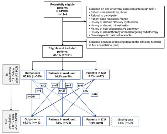Of the 1544 consecutive eligible patients with SARS-CoV-2-positive RT-PCR, 481 patients were included (details in Figure 1). Among the 481 patients included, we recorded at the first consultation: 80% of outpatients (n = 385/481), 16.4% of patients admitted to a medical unit (n = 79/481), and 3.5% of patients admitted to an ICU (n = 17/481). At the second consultation, seven to ten days later, there were 85.7% of outpatients (n = 412/481), 7.9% of patients in a medical unit (n = 38/481), and 1.9% of patients in an ICU (n = 9/481); data were missing for 22 patients. Among the patients who were discharged after their RT-PCR at the first consultation, only 2.1% (n = 8/385) were hospitalized between the first and second consultations; 1.6% of them went into a medical unit (n = 6/385) and 0.5% into an ICU (n = 2/385); data were missing for 13 patients. One patient who was hospitalized in a medical unit at the time of the first consultation was transferred to an ICU by the time of the second consultation. Overall, there was a 1.9% (n = 9/481) unfavorable trend in medical management in our total population between the first and second consultations, whereas 11% (n = 53/481) of patients experienced improvement in their clinical situation during follow-up. Details appear in the flow chart of the study (Figure 1).