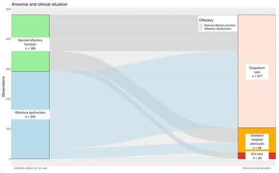 Alluvial plot of the distribution of patients’ “worst clinical situation” along follow-up according to olfactory function status at first consultation. Footnotes: We used the proxy of the “worst clinical situation” for each patient corresponding to the heavier medical care needed along the course of the disease between C1 and C2. Numbers (n) cor-respond to patients. Abbreviations: ICU, intensive care unit.
