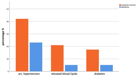 When comparing the prevalence of metabolic diseases in the past 12 months, 42.1% of the control group reported hypertension, 21.0% had elevated blood lipids, and 17.4% had diabetes. In the lipedema group, the prevalence was 23.1% for hypertension (p = 0.041), 5.1% for elevated blood lipids (p = 0.024), and 5.1% for diabetes (p = 0.089) (Figure 1).