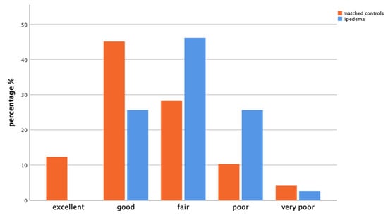 Comparison of the self-assessment of general health status showed significant differences between the two groups (p < 0.001). From the matched controls, 12.3% reported their health as excellent, 45.1% as good, 28.2% as fair, 10.3% as poor, and 4.1% as very poor. In contrast, no patients with lipedema rated their health as excellent, 25.6% rated it as good, most 46.2% rated it as fair, 25.6% rated it as poor, and 2.6% rated their health as very poor (Figure 2).