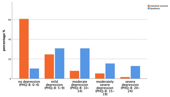 In total, 43.6% within the lipedema group and 18.5% within the control group reported experiencing depression within the last 12 months (p = 0.001), which is corroborated by the Patient Health Questionnaire PHQ-8 questionnaire results. We observed a higher prevalence and severity of depressive symptoms in the lipedema group (Figure 3), where only a small fraction (10.3%) reported no depressive symptoms compared with most matched controls (60.7%) who reported no depressive symptoms (PHQ-8 score 0–4). For mild depressive symptoms (PHQ-8 score 5–9), 24.6% of the control group and 30.8% of the lipedema group were affected. Moreover, 30.8% of the lipedema group reported moderate depressive symptoms (PHQ-8 score 10–14), compared with 7.9% in the control group. Furthermore, the prevalence of more severe depressive symptoms was notably higher in the lipedema group. While 5.2% of controls reported moderately severe symptoms (PHQ-8 score 15–19), this was the case for 15.4% of those with lipedema. Additionally, severe depressive symptoms (PHQ-8 score 20–24) were reported by 1.6% of the control group, compared with 12.8% of the lipedema group.